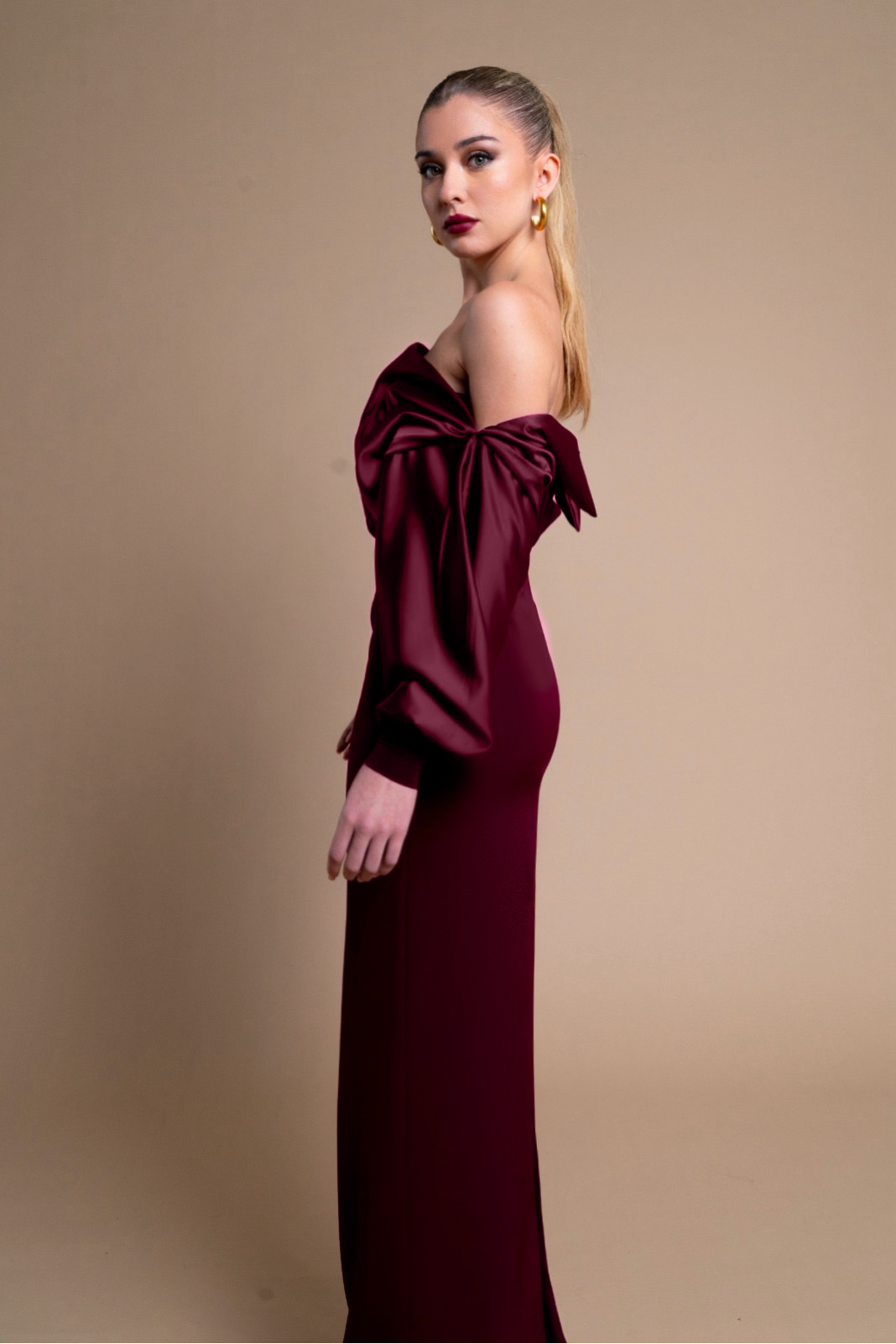 Vestido de fiesta largo en color burdeos vino. De corte recto con abertura en el bajo de la espalda, ajustado a al cintura y cadera, compuesto por un cuerpo drapeado con escote bardot con mangas anchas con puño ajustado. Confeccionado en un exquisito tejido de crepe de seda y satén de seda. El vestido lleva forro de crepe de seda.