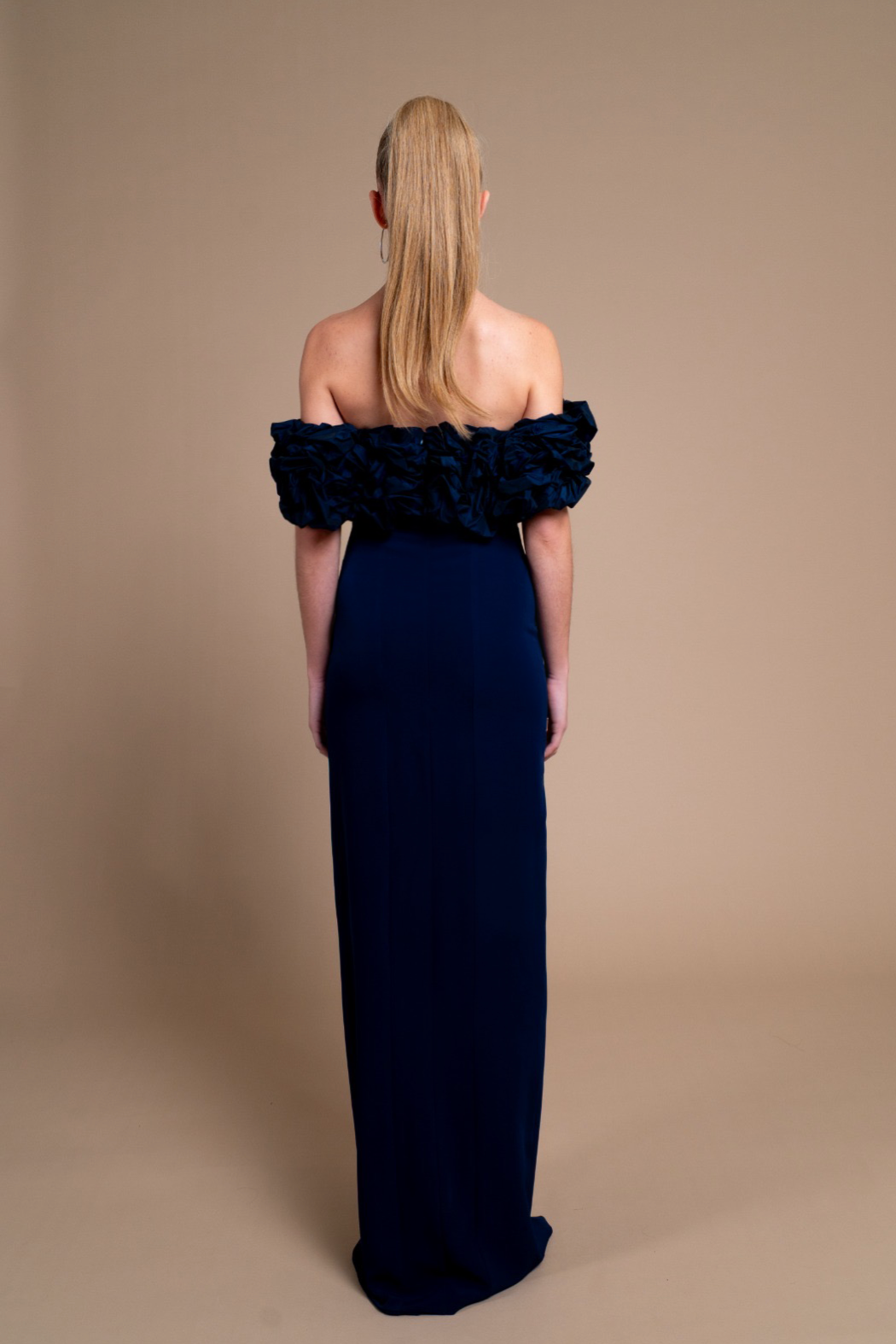 Vestido de fiesta largo en color azul marino. De corte recto ajustado a al cintura y cadera, con una abertura central y compuesto por un corsé de palabra de honor decorado con bodoques. Confeccionado en un exquisito tejido de crepe de seda y tafetán. El vestido lleva forro del mismo tejido.