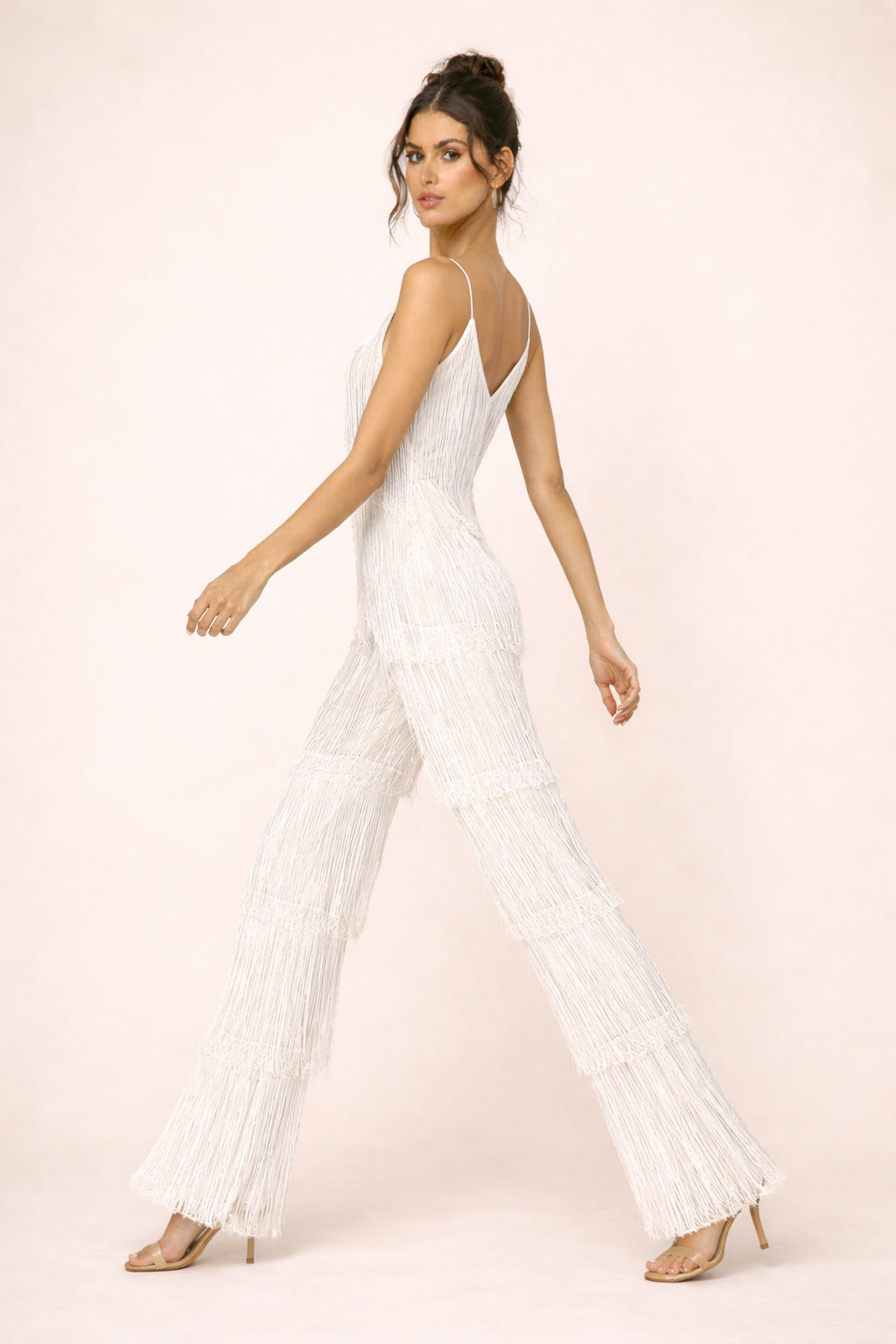 Mono de flecos largo blanco roto. Compuesto por un escote en pico con tirantes finos y por unos pantalones largos, decorado de arriba abajo con flecos de seda de 30cm. El forro está confeccionado con un exquisito tejido de punto de seda.